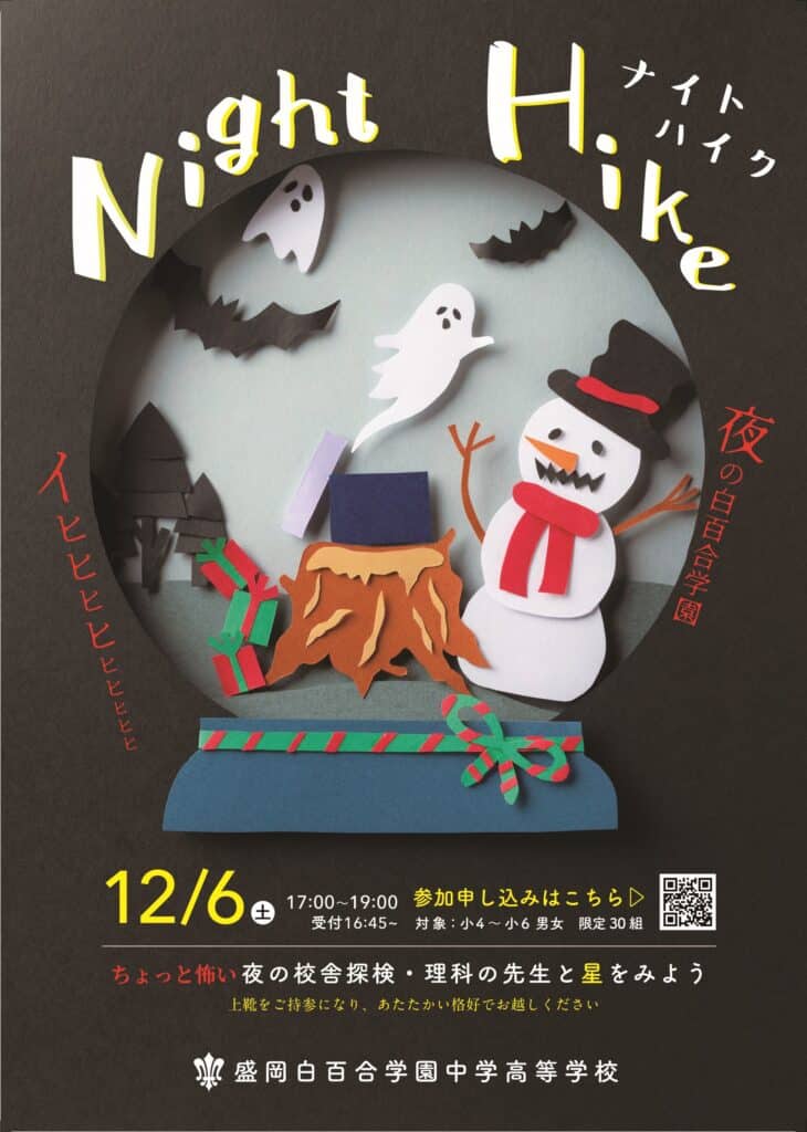 12月6日(土)17時から、夜の校舎探検や理科の先生と星空を観察するイベント「ナイトハイク」を開催します。対象は小学4年生~6年生の男女限定30組です。下記のフォームからお申込みください。